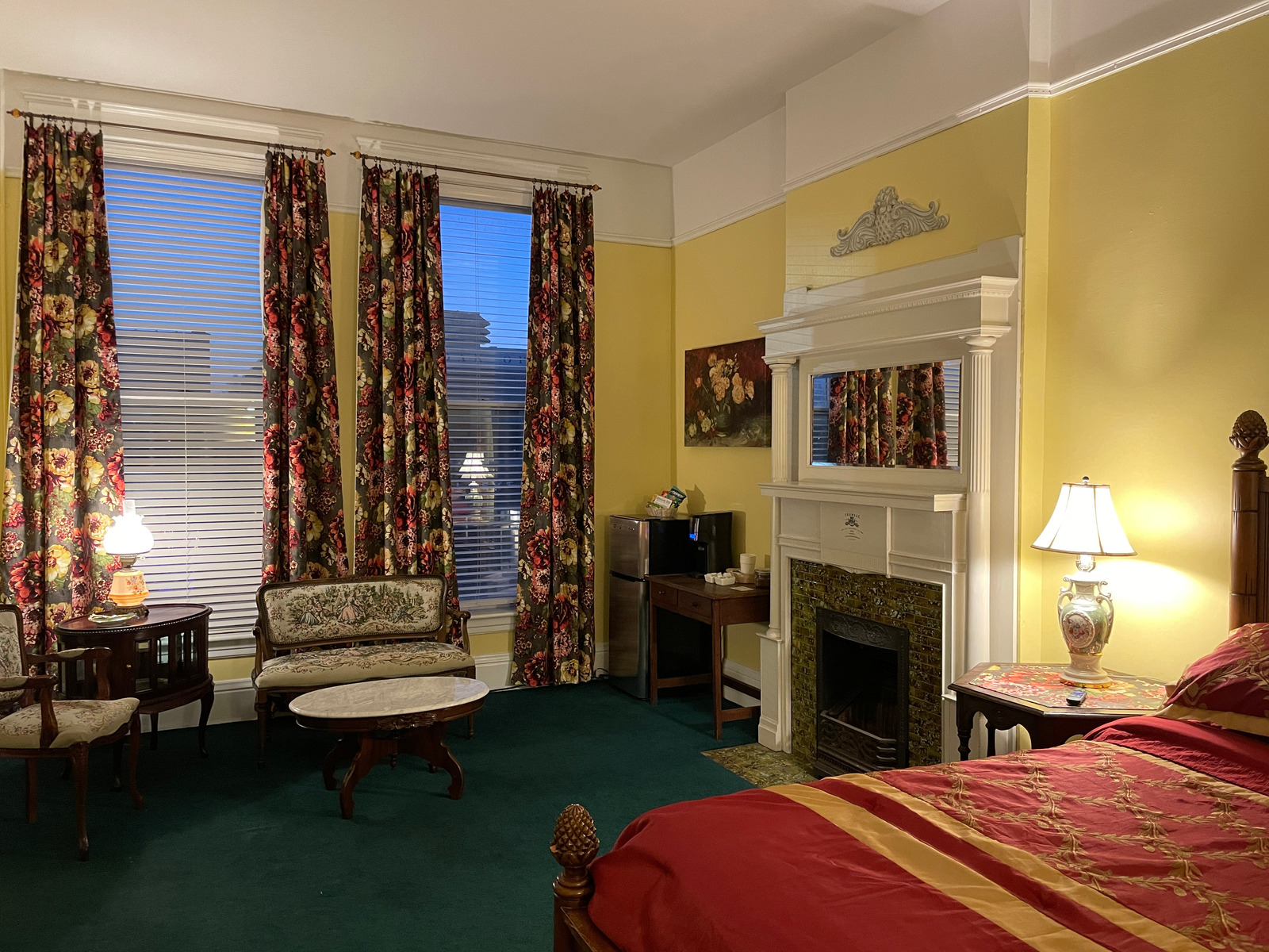 This vintage second-floor room offers a single King-Sized bed and a private bathroom with a shower. The bedroom has a spacious parlor area with casual seating, allowing extra play and sleeping room for families with children. Built in 1901, this room features one of the three original fireplaces that have been spectacularly maintained. This room also features a flat-screen TV with free Wi-Fi and streaming channels. Room 2 overlooks Michigan Avenue with a nice view of downtown Clinton. It also features spacious 11′ high ceilings and floor-to-ceiling windows.